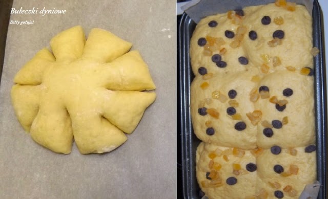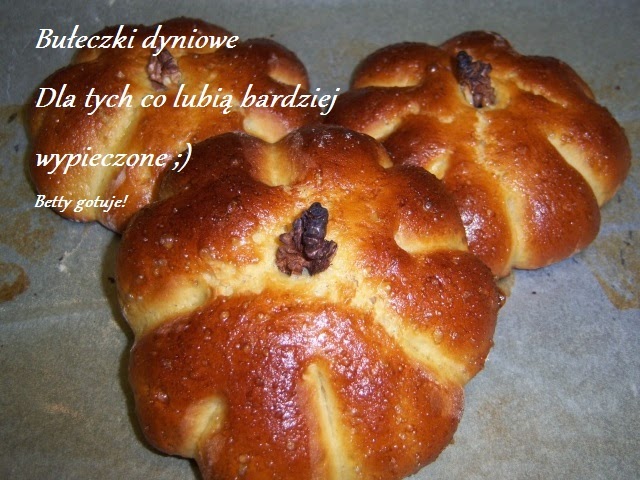 Przepis na bułeczki dyniowe jest miksem kilku przepisów z internetu, z kilku zaczerpnęłam coś. Dlatego też piekąc te bułeczki, byłam trochę zaniepokojona czy będą tak smaczne jak założyłam. Na szczęście moje obawy okazały się płonne, bo bułeczki wyszły pyszne. W całym domu wspaniale pachniało ciastem. Polecam szczególnie te pieczone w keksówce z dodatkiem kandyzowanej skórki pomarańczy i odrobiny czekoladowych chipsów. Wyrosły na całą wysokość keksówki. A dzięki bakaliom były bardziej słodkie, cudownie puszyste, wprost rewelacyjne na podwieczorek lub drugie śniadanie. Pozostałe miały przypominać dynie, ale przez moją nieobecność wyrosły tak bardzo, że aż rozpłaszczyły się nieco na blaszce. Mimo to są równie smaczne, słodycz nie jest wyczuwalna, te są idealne na śniadanie. Polecam!