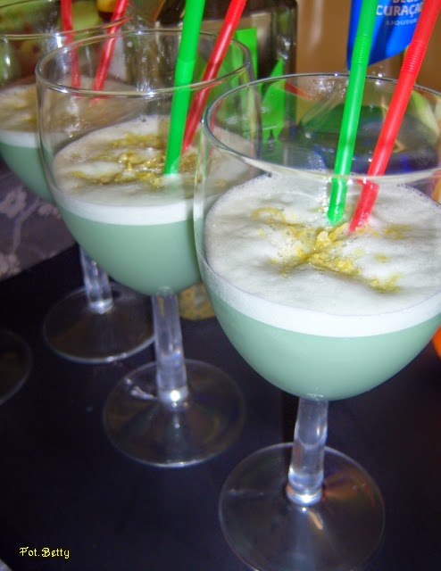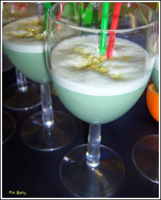 Przyrządzić w shakerze, odcedzić od lodu, podawać w kieliszku do wina. Oprószyć tartą skórką cytrynową. Podawać z 2 słomkami.