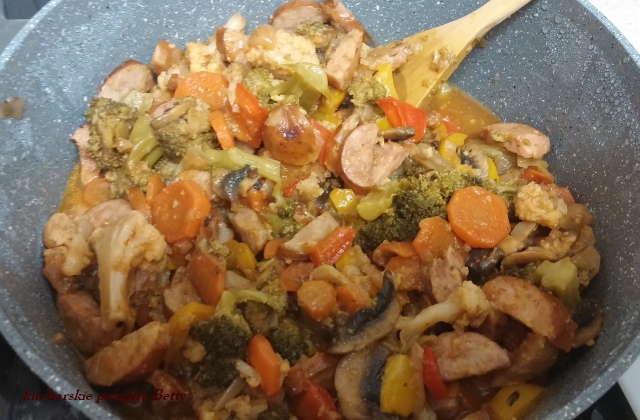 Na koniec idzie czosnek z papryką i brokułami. Powtarzamy ostatnią czynność (2-3 minuty smażenie bez pokrywy i duszenie pod przykryciem 5 minut.
