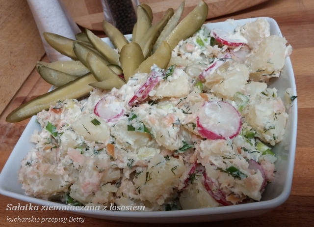 Wystudzone ziemniaki pokroić na ćwiartki lub w grubszą kostkę, wymieszać z zieleniną, rzodkiewkami, rozdrobnionym na cząstki łososiem i sosem.