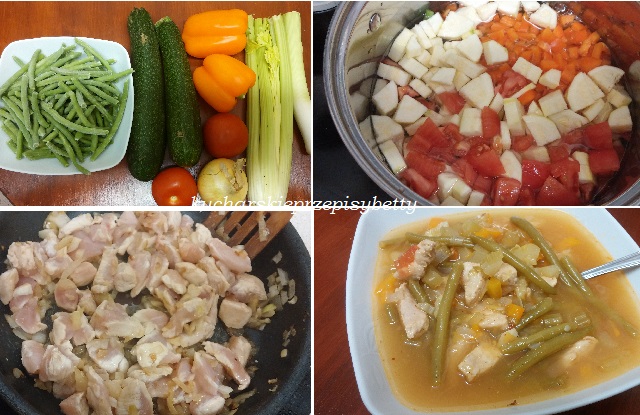 Tak samo jak w pierwszym przypadku postępujemy z warzywami. Gotujemy je 15 minut. W międzyczasie myjemy mięso i kroimy w kostkę. Cebulkę pokrojoną w kosteczkę wraz z drobno posiekanym czosnkiem przesmażamy na łyżce oleju. Dodajemy mięso, skrapiamy obficie sosem sojowym i smażymy chwilę by straciło całkowicie swój surowy kolor. Usmażone przekładamy do garnka z zupą. Wszystko razem doprawiamy i gotujemy jeszcze 10 -15 minut by fasolka była miękka